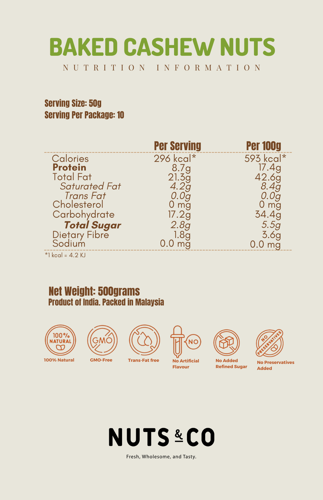 All nuts have different nutrition value and will offer various health benefits. They are known for being high in fiber, protein, healthy fats, and a variety of vitamins/ and minerals, much more nutritious than a bowl of potato chips. Now more than ever, nuts are recommended as the ideal snack. For recipes and cooking, both raw and baked / roasted cashew nuts are used, with baked / roasted cashew nuts providing a more crunchy texture than raw cashew nuts.